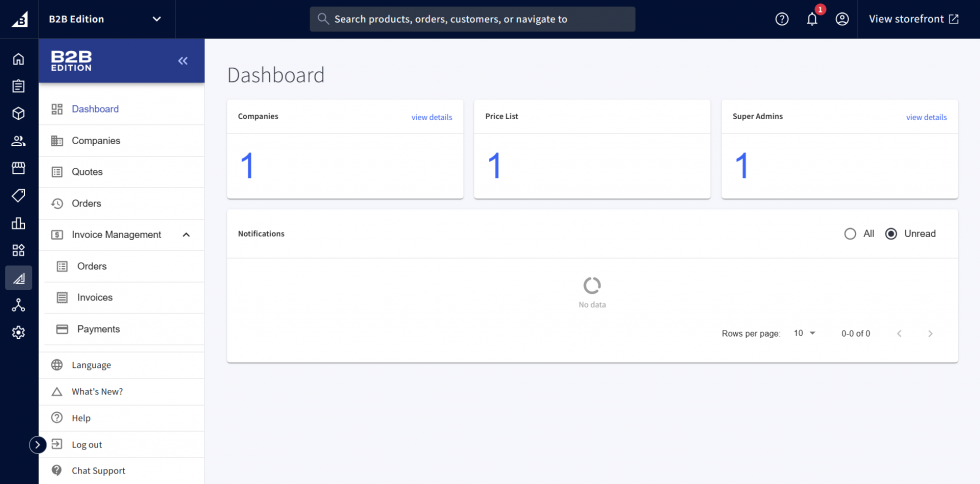 - Buyer Portal: B2B Edition provides a storefront dashboard for Company admins. The company admins can create and manage users, quotes, orders, and other B2B actions in this dashboard.