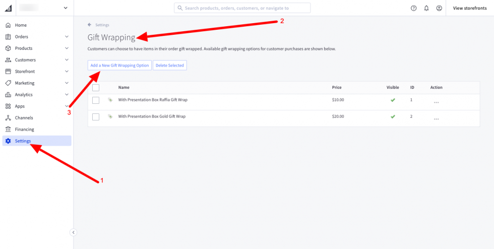 Schritt 1: Melden Sie sich zunächst in Ihrem Geschäft an. Gehen Sie dann zu Settings › Gift wrapping und klicken Sie Eine neue Option für Geschenkverpackungen hinzufügen.