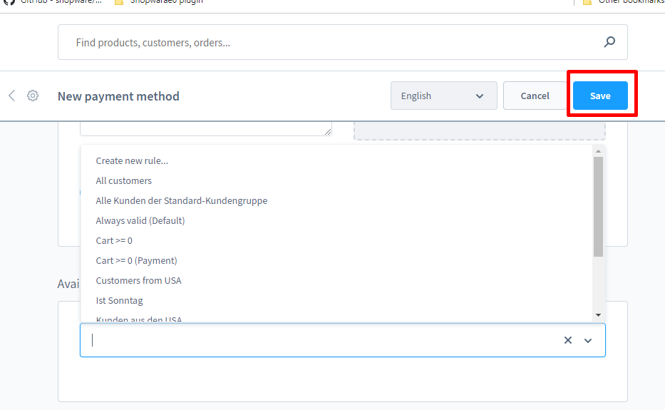 5. In the Availability rule you can determine when this payment method should be available. For this, you can use the rules of the Rule Builder or add a new rule to the Rule Builder directly from here.
