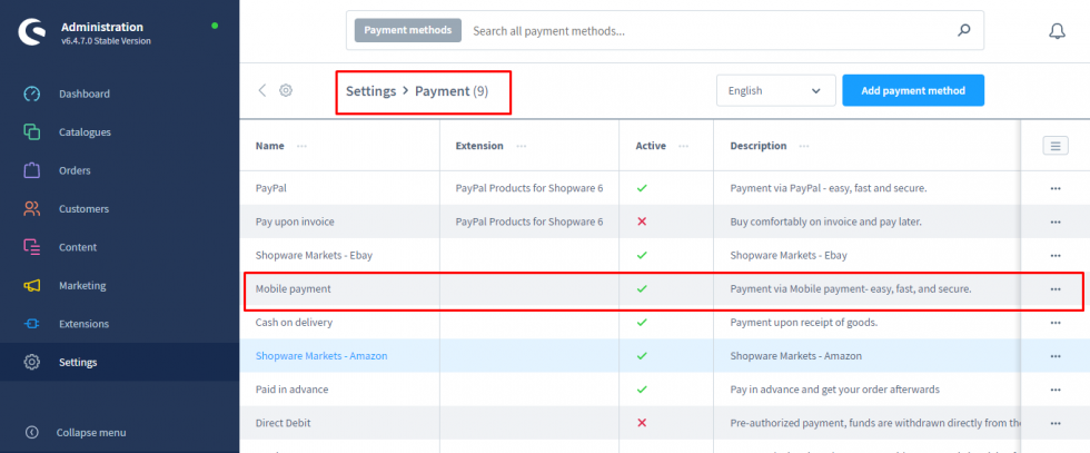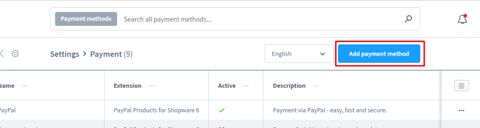 6. After saving the payment method you can see the newly added payment method in the list. settings > shop > payment
