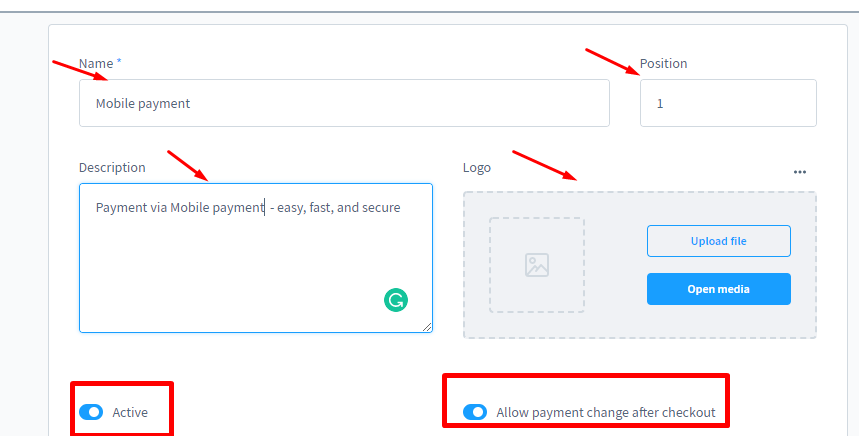 - Position: Enter the position of this payment method. This position determines the order in which the payment types are displayed in the shop.