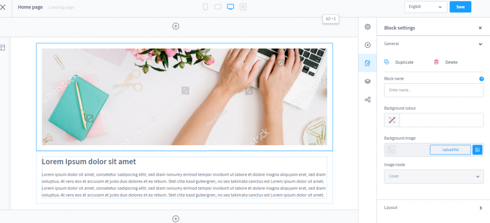 You can select the image category as a block section and drag and drop the image and also you can select the text from the block section and drag-drop. you can fill the all required fields as per your requirement.