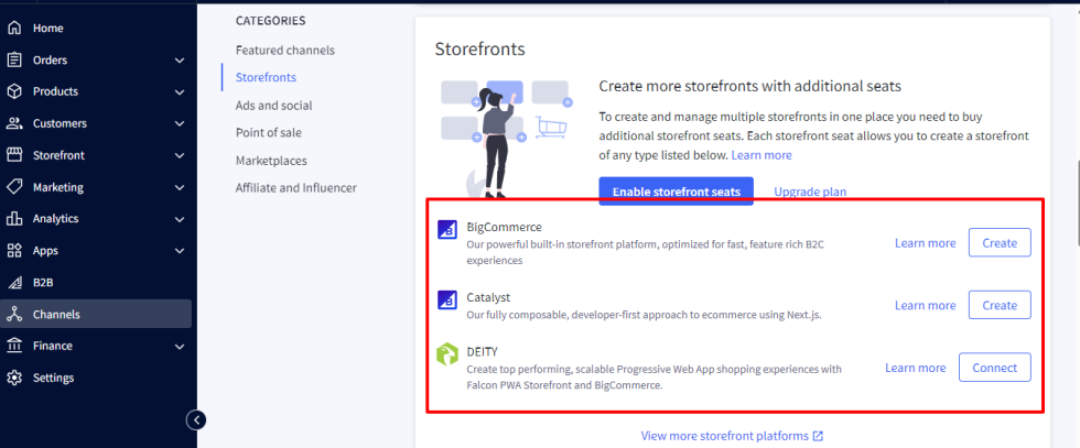 BigCommerce is a cloud-based open SaaS (Software as a Service) e-commerce platform designed for businesses to build, manage and grow their online stores. It has various native features like built-in SEO, no transaction fees, multi-channel selling. It allows the merchant to manage and sell physical and digital products, customize themes using drag-and-drop editor. Shopify is also a similar type of e-commerce platform but operates on a totally different business model.
